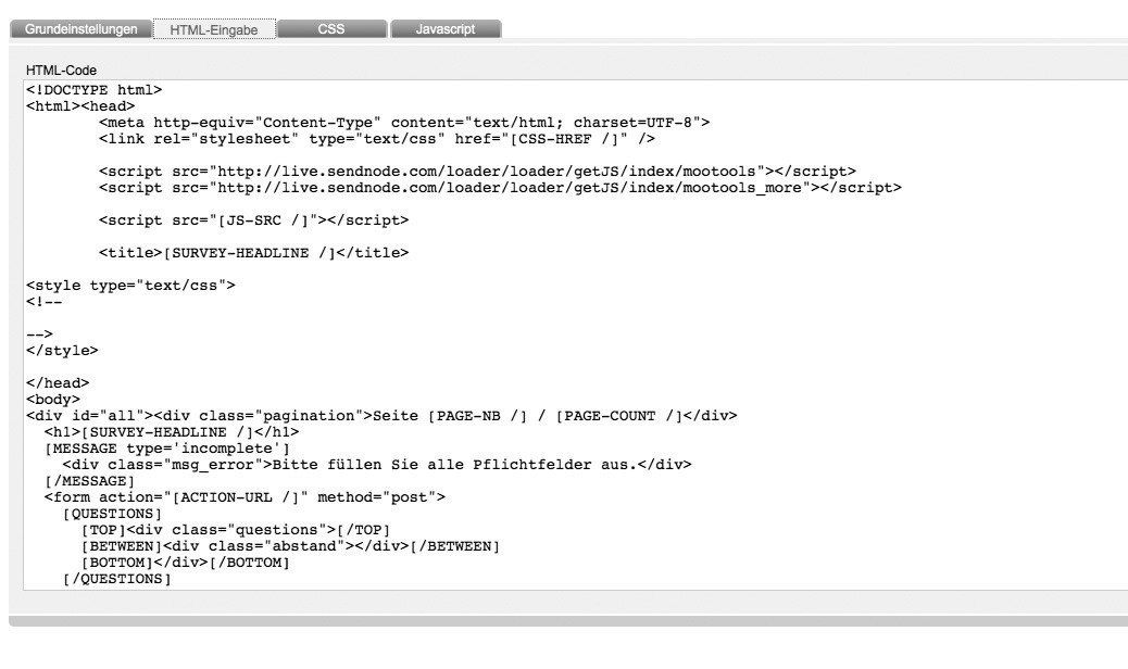 Insert your entire html source code. By creating a new template, dsmails generates a sample html source code with all important survey-placeholders automatically in this tab.
