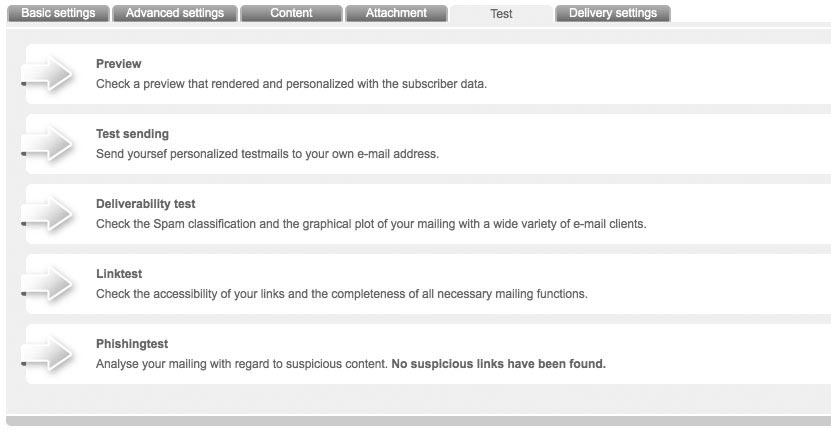 Having finished your newsletter, dsmails offers you numerous testing possibilities. This helps you to optimize your mailing and achieve maximum success before actual dispatch. You can get to the testing functions by choosing the tab 'Test' in the menu in which you edit your mailing. Following tests are available: |