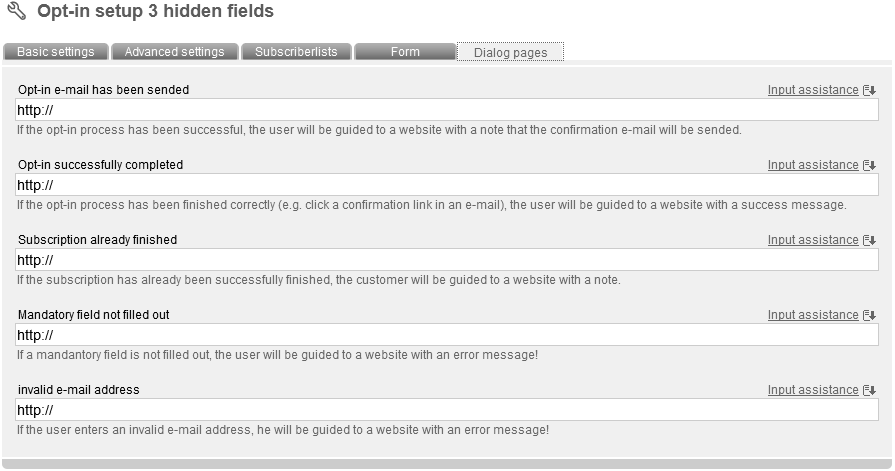 Now enter a name and an optional description for your optin setup. Then choose the 'mode' (important). The following modes are supported by 'dsmails': Double Opt-in with confirmation e-mail (recommended as the only legally secure login variant): Interested party visits a website with an optin setup form. He enters his data into the form. He gots an e-mail with content like this: „Thank you for your optin. Please confirm the registration confirmation link to complete your registration.“ He clicks the link. Registration is completed. He gots a „welcoming“ e-mail. You can integrate information about your company and a certain design as well. Double Opt-in: Like described before, but without sending of a „welcoming“ e-mail. Confirmed Opt-In: Nach Anmeldung auf der Webseite wird sofort eine automatische Begrüßungsnachricht versendet. Single Opt-in: No e-mails will be send. There just will be a message in your browser, that registration was successfull. According to the mode you've choosed, you have to adapt different sub-options. In Tab 'advanced settings' you can deposit your e-mail address in field 'e-mail forwarding', to be informed about new subscribers. In field 'mailing for later delivery' you can determine your last sended newsletter. All new subscribers will receive your last mailing and don't have to wait for another one. To protect your optin-form against abuse, activate the invisible captcha . Captchas are often used to check if petitions are produced by a machine (robot, short: bot) or a real person. Bots are often used abusive to generate masses of subscriptions. Choose your favorite subscriberfields, which should be filled in in next tab 'Form'. After clicking 'Add subscriberfield' a pop up appears, where you can select and add subscriberfields to your optin-form. Furthermore you can add one or more subscriberlists as option(s) in a ceckbox through the button 'add subscriberlist'. Click 'sort formfields' to edit order of your fields. Click 'test form' to check your form by a preview of your optin-form. Next tab: 'Dialog pages':