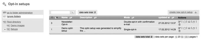 Through 'Setups' and 'Optin Setup' you can create forms, which can be included into your website. So interested parties can login automatically on your website for your subscriberlist(s). Please note: Requirement for a successfull 'optin setup' is to create an e-mail with type 'dialog mailing' for registration confirmation and welcoming, which got the status 'activated'. Otherwise those mailings will be lacking in the shortlist of mailings which you can choose for your optin setup. For an esier start dsmails gots a „Demo optin setup“ for you. Created optin setups can be 'opend' afterwards for editing, 'moving' to another folder or 'deleting'. If you have moved an optin setup into another folder, click 'open folder' to get into. Create new Optin setup |