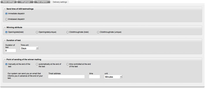 In the last tab you define the settings for the dispatch. Determine by which criterion (opening-rate or click-through-rate) dsmails should identify the winner. Equally important is to determine the duration of the test.