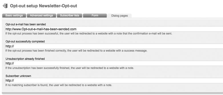 Enter a name and an optional description. Choose the 'mode' (important). The following modes are supported by 'dsmails': Double-optout with confirmation e-mail: after unsubscribe from your website or your newsletter a confirmation email will be send automatically. Optout will be activated after clicking the confirmation link in this email. After successful unsubscription the former subscriber will get a last email („You unsubscribed successfully of our newsletter.“) Double Optout: Like described before, but without sending of a „successful unsubscription“ e-mail Confirmed Opt-Out (recommended): After unsubsubscription on your website or in your newsletter a „successful unsubscription“ email will be sended immediately. Single Optout: No e-mails will be send. There just will be a message in your browser, that optout was successfull. In Tab 'advanced settings' you can deposit your e-mail address in field 'e-mail forwarding', to be informed about unsubscriptions. Tab 'subscriberlists': Choose your favorite subscriberlist(s), where all unsubscriptions should be logged out. Select the subscriberfields, which should be filled out by your subscribers in tab 'Form'. After clicking 'create form fields' a popup appears, where you can choose and add subscriber fields to your form. Click 'sort formular fields' to arrange your fields. Click 'test form' to open a new tab in your browser with a preview of your form. Source Code of your website is genereated by 'dsmails' by clicking 'Formular soruce code'. A popup appears with your source code. Last tab: Dialog pages |