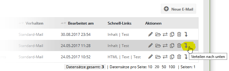 Haben Sie das Modul 'Redaktionssystem Advanced' für Ihr Multi-Account-System gebucht, lassen sich Elemente wie E-Mails, Templates, Zielgruppen oder Kampagnen zentral im Adminaccount erstellen und anschließend in die Subaccounts der Kunden verteilen. Auch das Verteilen aus einem Subaccount nach oben in den Adminaccount oder in andere Subaccounts ist möglich. In den Übersichten von E-Mails, Templates, Kamapgnen und überall dort, wo sich Elemente verteilen lassen, finden Sie in der Spalte 'Aktionen' ein Pfeil-Symbol zum Verteilen.