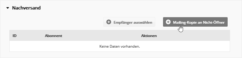 Haben Sie alle Empfänger für den Nachversand ausgewählt, klicken Sie auf 'Jetzt nachversenden'. Damit startet der Nachversand. Die Nachversendungen werden gemeinsam mit den bisherigen Empfängern in der E-Mail-Statistik erfasst. Nachversand an alle Nicht-ÖffnerSie möchten die Nicht-Öffner eines versendeten Mailings erneut anschreiben? Öffnen Sie das gewünschte Archivmailing. Klicken Sie auf dem 'Versand'-Reiter im Bereich 'Nachversand' den Button 'Mailing-Kopie an Nicht-Öffner'.